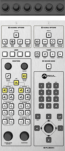 Module Master avec moniteur Deluxe, commandes de volume pour le casque et la prévisualisation, touches de sélection dédiées pour le programme, les envois auxiliaires ou le moniteur externe. Quatre touches utilisateur programmables pour le déclenchement de salves de routage, le contrôle des périphériques ou d'autres fonctions programmées sur mesure. Entrée numérique/cadran pour utilisation avec les modules Fusion Phone. Pavé de navigation pour le contrôle des options à l'écran ; les contrôles de délai de blasphème peuvent être reliés à une unité de délai externe. Inclut un ensemble de contrôle de pont SoftKnob. Occupe 4 positions de cadre. Un module de moniteur par console est nécessaire.