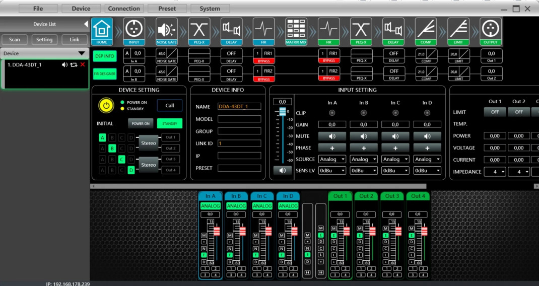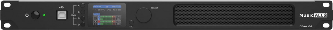 Le DDA-43DT est un amplificateur de puissance DSP réseau à 4 canaux, intégré avec un processeur DSP, un écran couleur IPS et d'autres fonctions puissantes. Cet amplificateur de puissance prend en charge diverses méthodes d'entrée : réseau analogique. L'utilisateur peut sélectionner chaque signal analogique ou Dante avec sa priorité, ce qui permet de réaliser la fonction de sauvegarde du signal. Prise en charge de la résistance constante 8Ω/4Ω et de la tension constante 100V/70V. La fonction de magnitude et de phase linéaire automatique FIR standard offre à l'utilisateur une méthode puissante pour configurer les paramètres du haut-parleur.L'installateur peut définir une puissance de sortie maximale / tension / courant pour chaque canal. Cet amplificateur peut être utilisé avec n'importe quelle enceinte dans n'importe quel projet. Cet amplificateur peut être adapté à toutes les conditions.