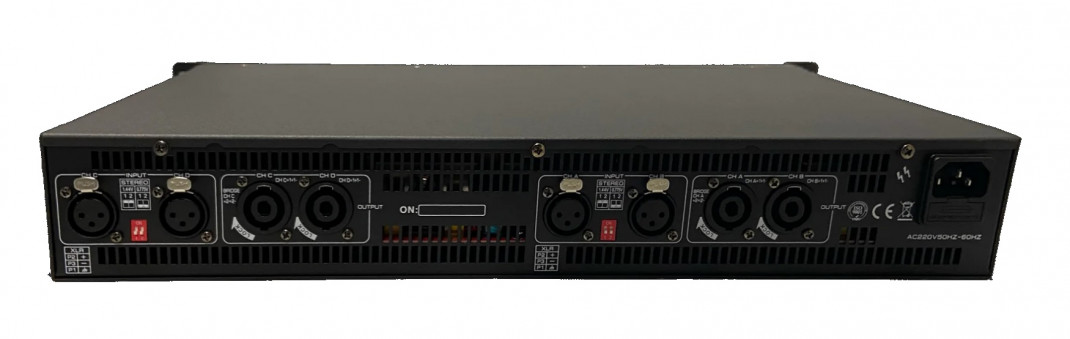 Quatre entrées sur connecteur XLR symétrique. Quatre sorties sur connecteur Speakon symétrique.
