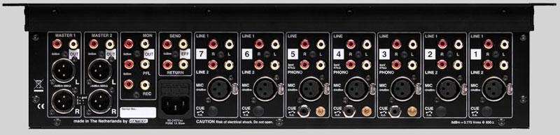 Chaque canal d'entrée peut traiter trois signaux audio différents. Un simple appui sur le bouton permet de basculer entre les entrées micro et ligne. Lorsque les entrées ligne sont actives, un second bouton permet de basculer entre ligne 1 et ligne 2. Les entrées 3, 4 et 5 sont équipées d'un filtre de correction RIAA permettant de connecter directement des platines vinyles. Au total, 21 entrées audio sont disponibles ! Une table de mixage de cette qualité se distingue par ses sorties symétriques sur connecteurs XLR. Outre ces sorties symétriques, des sorties asymétriques sont également disponibles sur connecteurs RCA.