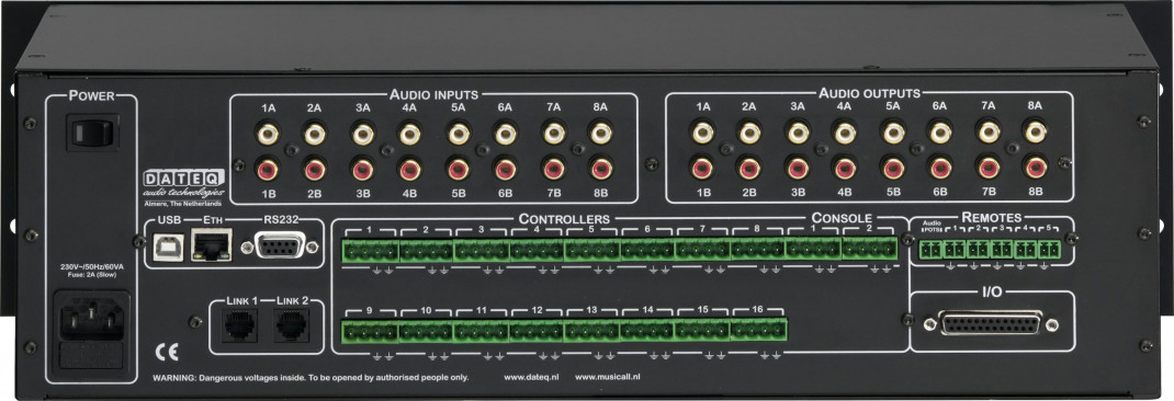 Matrice de radiomessagerie multizone Système de musique, matrice pour 16 zones, 16 entrées audio, 16 sorties de zone, configurable en mono ou stéréo, connexion pour 2 panneaux de radiomessagerie MPC16A