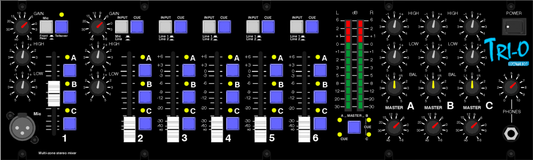 Le DATEQ TRI-O est un mélangeur matriciel 19 pouces à 6 canaux et 3 zones. Il convient parfaitement à une utilisation dans les pubs, les écoles de danse, les centres de conférence ou tout autre projet multizone. Le TRI-O est équipé de trois entrées micro et de huit entrées ligne stéréo. Les entrées peuvent être routées vers les trois sorties master indépendantes.Le DATEQ TRI-O est un mélangeur matriciel 19 pouces à 6 canaux et 3 zones. Il convient parfaitement à une utilisation dans les pubs, les écoles de danse, les centres de conférence, etc. Le TRI-O est équipé de trois entrées micro et de huit entrées ligne stéréo. Les entrées peuvent être acheminées vers les trois sorties master indépendantes.
