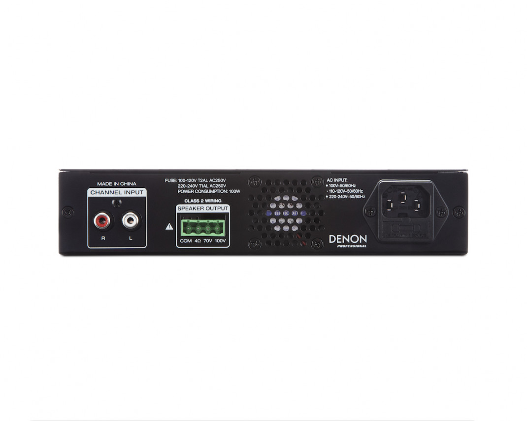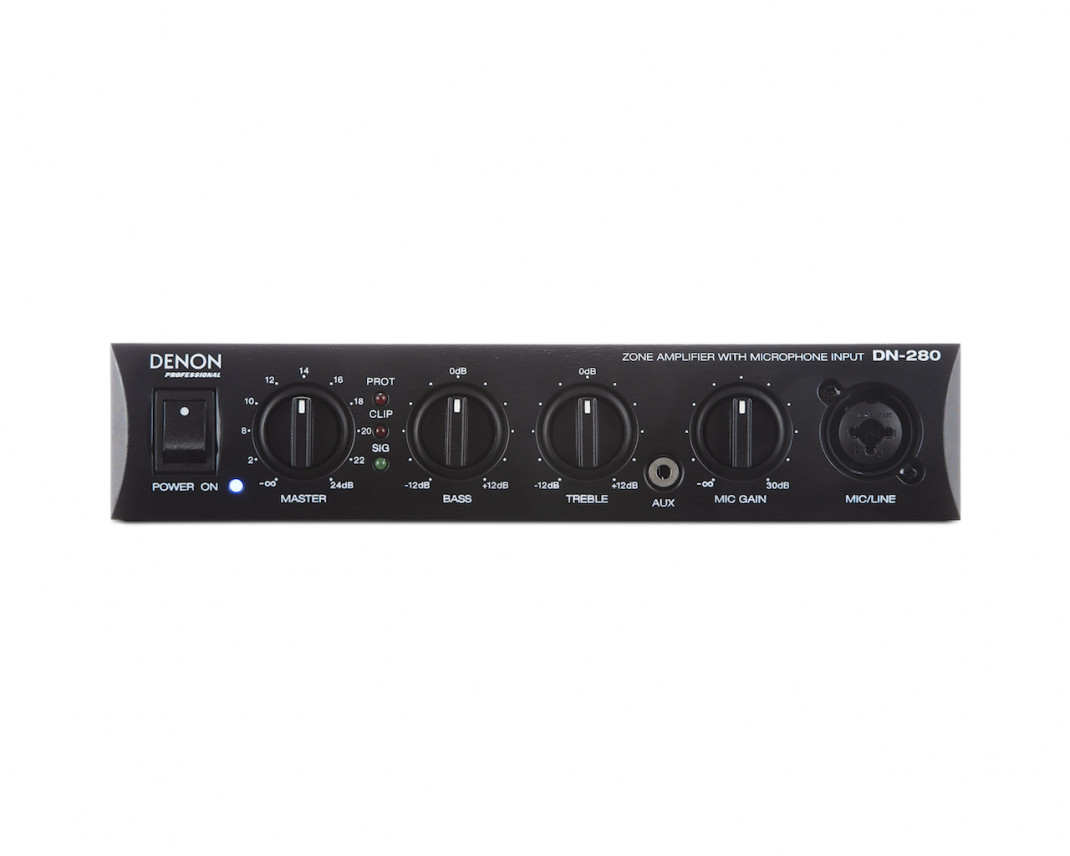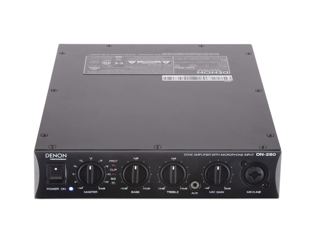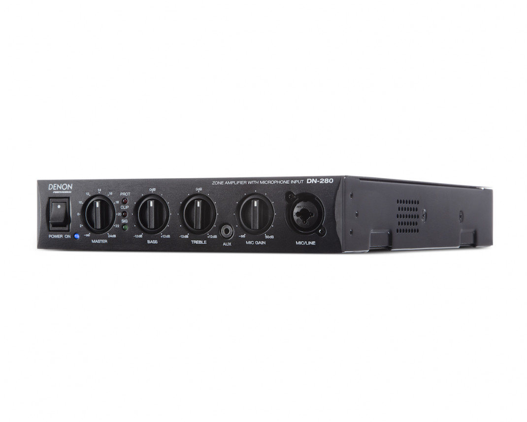 Si vous avez besoin d'un amplificateur compact et puissant qui additionne les signaux stéréo en une sortie mono pour les applications de radiomessagerie, d'annonces sonores et de musique de fond, le Denon Professional DN-280 est la solution idéale. Peu encombrant, le DN-280 est doté d'une entrée microphone pour la radiomessagerie, d'une entrée AUX de 3,5 mm (1⁄8-inch) sur le panneau avant et d'entrées analogiques stéréo (additionnées en MONO) pour les signaux provenant d'appareils de lecture externes tels qu'un iPhone ou un tuner stéréo.L'amplificateur prend en charge une charge 4Ω ou un fonctionnement en 70V/100V des haut-parleurs, ce qui est parfait pour l'installation de plusieurs haut-parleurs dans les petits magasins de détail ou les cabinets médicaux. Un amplificateur de classe D puissant et froid fournit 100 watts avec un THD de <0,1 % et un rapport signal/bruit exceptionnel de >95dB, assurant des performances extrêmement propres dans toutes les conditions. Le DN-280 possède une protection intégrée contre les courts-circuits et des indicateurs LED en façade pour la présence de signaux, l'état d'écrêtage et l'interruption thermique.