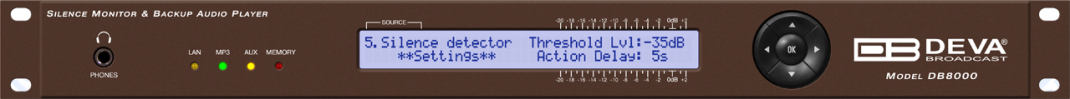 Le DB8000 Silence Monitor est conçu pour éliminer les situation de 'blanc' à l'antenne. En cas de perte audio, l'appareil détectera le silence et passera directement à l'entrée AUX ou au lecteur de secours intégré (lecture de fichier MP3). Les fichiers audio et les listes de lecture peuvent être téléchargés sur l'appareil à partir de votre PC via n'importe quel client FTP. De plus, le module interne de contrôle des basses et des aigus permet un réglage personalisé de l'audio provenant du lecteur de secours (fichiers MP3).L'appareil est doté de fonctions de télécommande DTMF ; une combinaison de tonalités DTMF à 3 chiffres permet de modifier l'entrée de la source audio ou de lancer n'importe quelle liste de lecture à partir du lecteur audio MP3 intégré. Grâce à cette fonction, le DB8000 peut être utilisé pour l'insertion de contenu local ou d'un spot publicitaire régional.