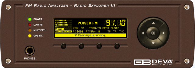 Radio Explorer III FM est l'outil d'étude de la couverture FM le plus avancé de DEVA Broadcasts. Tirant parti de leur expertise considérable, de leur vaste savoir-faire et de leurs années d'expérience, nos ingénieurs ont développé un produit qui conserve toutes les meilleures caractéristiques de ses prédécesseurs, mais qui s'en inspire également pour améliorer encore les performances de surveillance. Le système FTP intégré vous permet de télécharger et de gérer les fichiers à l'aide du logiciel DEVA Device Manager.L'attrait du Radio Explorer III FM réside non seulement dans sa fiabilité, mais aussi dans le second tuner dont il est équipé - une approche innovante dans cette gamme de produits, garantissant un niveau d'efficacité et de précision bien plus élevé. Utilisé pour collecter les informations RDS AF et pour effectuer un balayage PI, ce tuner réduit à la fois le temps nécessaire à la surveillance d'un canal et la distance entre les points de la carte dans le journal.