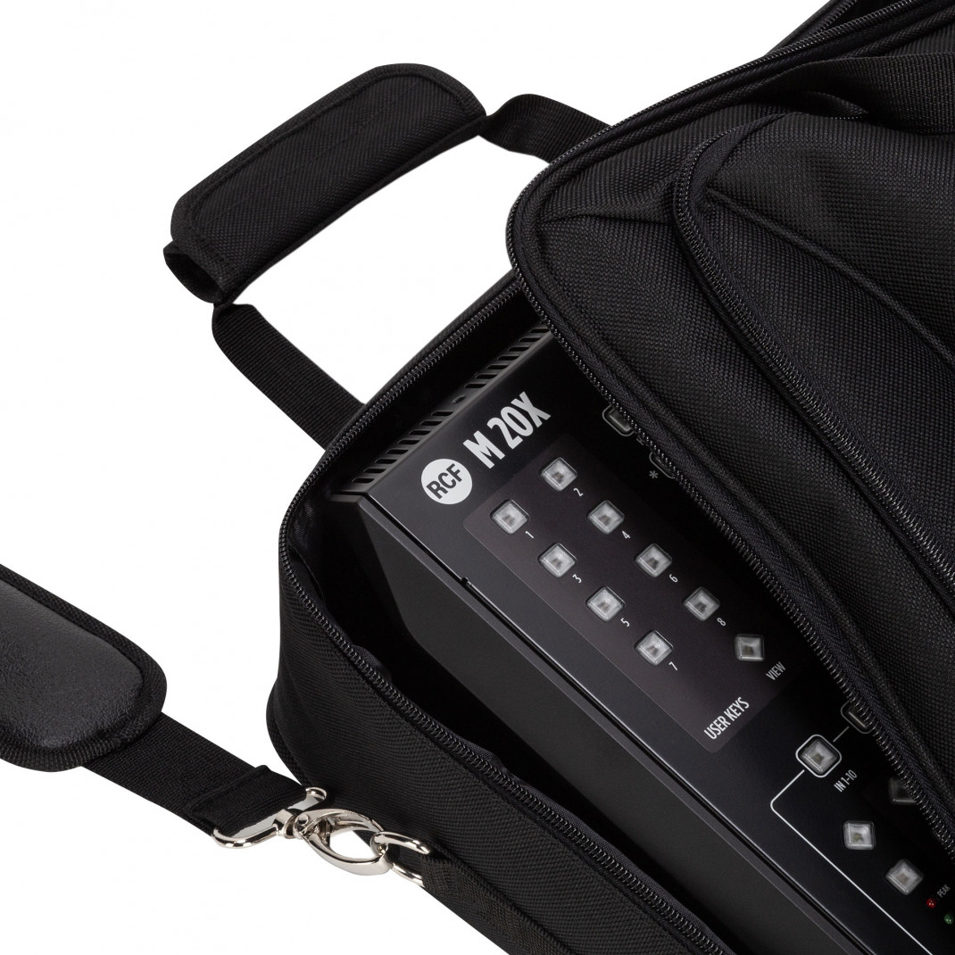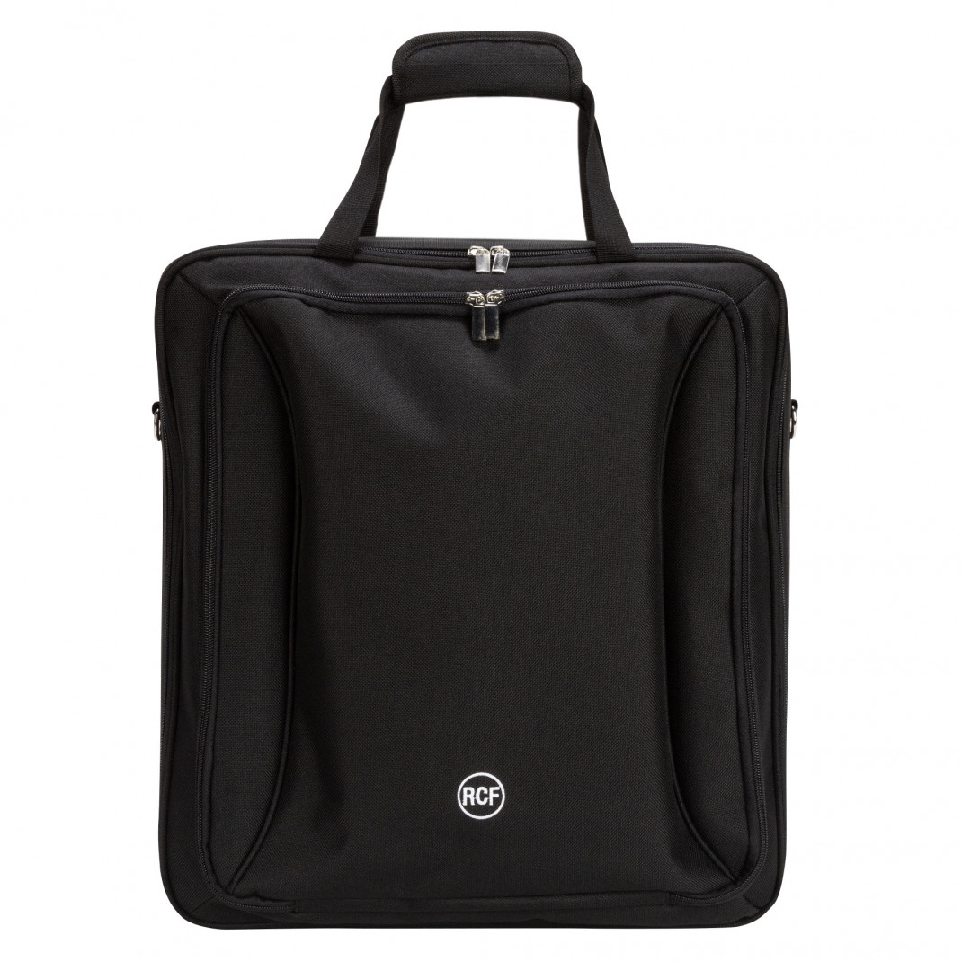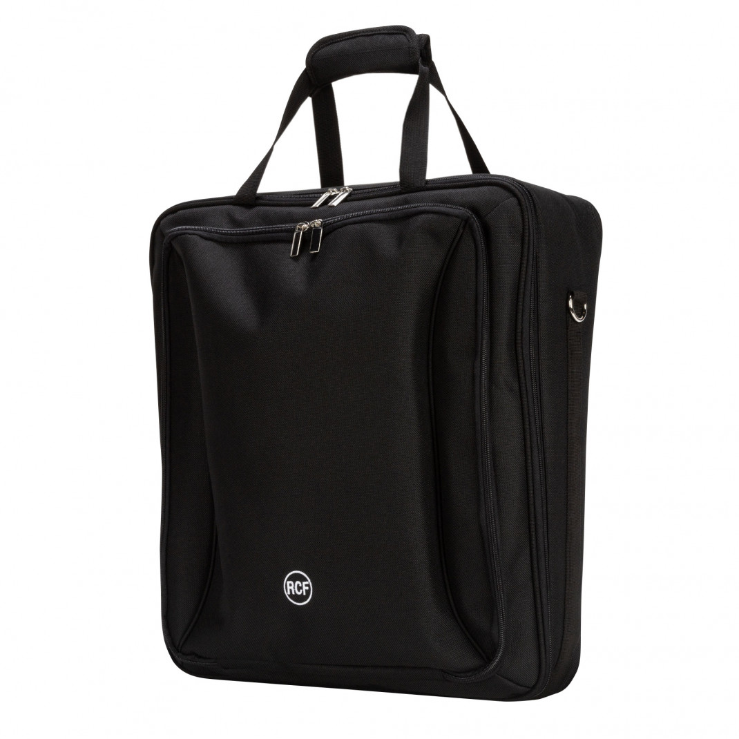 Sac de transport rembourré pour les mixeurs RCF M 20X et E 12 avec poignée et bandoulière. Large poche frontale avec compartiment séparé pour les tablettes ou autres accessoires.