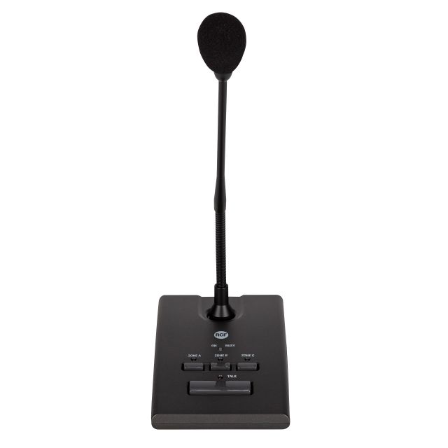 Le microphone d'annonce BM 3003 permet de faire des annonces sélectives dans trois zones et constitue le complément idéal du mixeur/amplificateur RCF ES 3323 avec tuner et lecteur MP3 CD/USB.