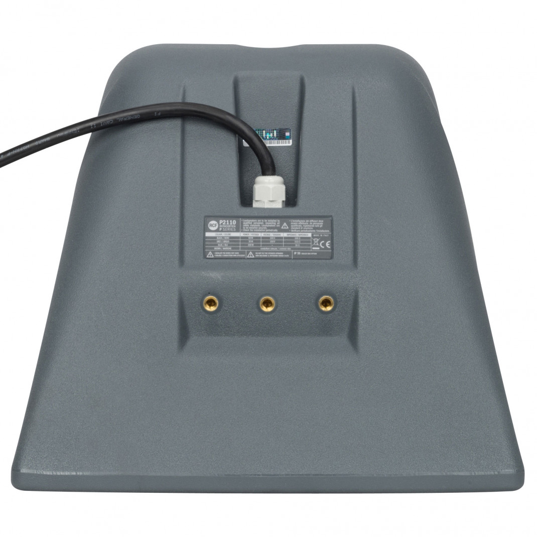 Le P 2110T est un système de haut-parleurs coaxiaux à deux voies, à large dispersion et à gamme étendue, résistant aux intempéries, destiné à une variété d'applications professionnelles en intérieur ou en extérieur. Le haut-parleur peut être installé individuellement ou couplé dans des configurations d'array. Le transducteur basse fréquence est un woofer de 10 pouces avec une bobine mobile de 2,5 pouces. La section haute fréquence combine un haut-parleur à compression de précision RCF de 1 pouce avec un diaphragme de 1,5 pouce monté au centre de la gorge du haut-parleur basse fréquence et chargé sur un pavillon CMD à directivité constante pour une dispersion large et régulière. Le P 2110T est équipé d'un transformateur de ligne sélectionnable pour les applications 70-100 volts, d'un filtre LICC intégré et d'une protection active du circuit de compression par Mosfet (AMCDP). Le boîtier roto-moulé d'une seule pièce est entièrement protégé contre les UV et répond aux exigences de la norme IP-55. Sont inclus des inserts M10 en laiton (12 x) et un support en U en acier inoxydable 316P résistant à la corrosion avec des entretoises (2x) pour un montage à 90°. Le couvercle de la grille en aluminium est recouvert d'un revêtement en poudre avec un matériau de support hydrofuge et une plaque de logo rotative.