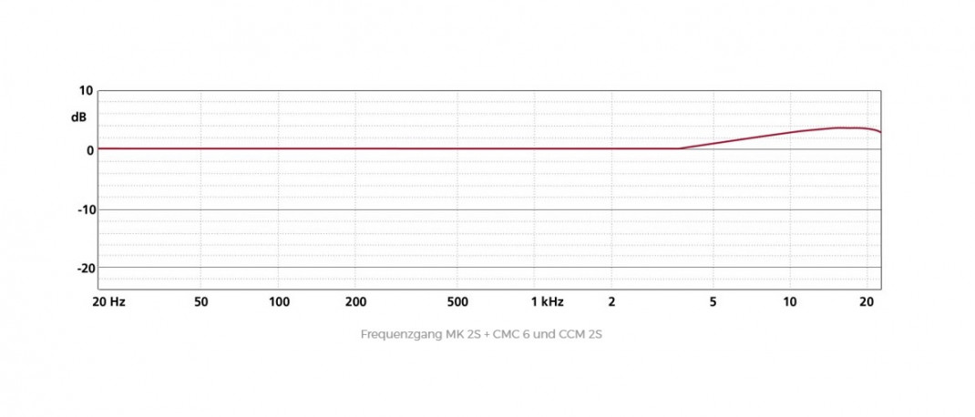 Avec la MK 2XS (anciennement MK 3), nous avons créé un type de capsule qui, à grande distance de la source sonore - c'est-à-dire dans un champ sonore diffus, en dehors du rayon de réverbération - compense les pertes dans les aigus et éclaircit quelque peu la composante spatiale. L'accentuation des aigus indiquée dans la réponse en fréquence disparaît dans la pratique lorsque le microphone est placé loin de la source sonore dans les pièces.En revanche, en cas d'incidence sonore frontale à une distance réduite, l'accentuation des aigus se fait nettement sentir, ce qui donne une image sonore particulièrement brillante.