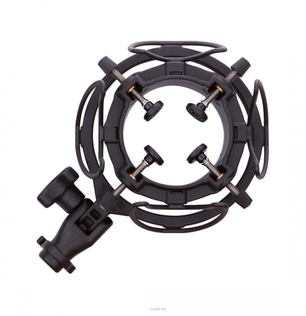 Le pied de l'USM-V4 a un filetage intérieur de 3/8". Un adaptateur pour 5/8" est fourni.Basé sur la Rycote USM, avec l'icône V4 sur les vis.