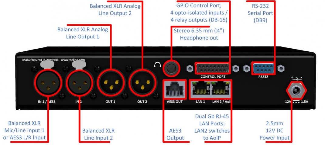 - IP (compressé) : Opus, Tieline Music, Tieline MusicPLUS, G.711, G.722, MPEG Layer 2, AAC-LD, AAC-ELD, AAC-LC, AAC-HE, AAC-HEv2, 16/24 bit Enhanced apt-X*