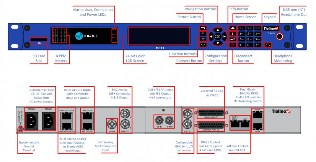 Tieline’s MPX I and MPX II codecs deliver composite FM multiplex (MPX) codec solutions for real-time network distribution of FM-MPX or MicroMPX (μMPX*) signals to transmitter sites. The MPX I is ideal for transmitting a composite STL signal from a single station with return monitoring, whereas the Tieline MPX II can transport two discrete composite FM-MPX signals from the studio to transmitters with return monitoring.Both the MPX I and MPX II support sending the full uncompressed FM signal, or compressed μMPX to deliver high-quality multiplexed FM signals at lower bit-rates. They support analog MPX (BNC) or MPX over AES192 to deliver a wide range of flexible composite encoder and decoder configurations for many different applications. Order an optional satellite tuner card at purchase to support decoding DVB-S or DVB-S2 signals.