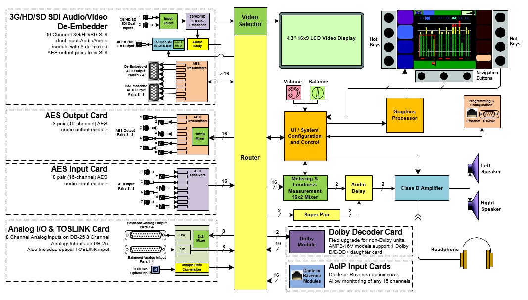 - 16 canaux complets de mesure et de gestion de l'audio simultanés et de formats mixtes.