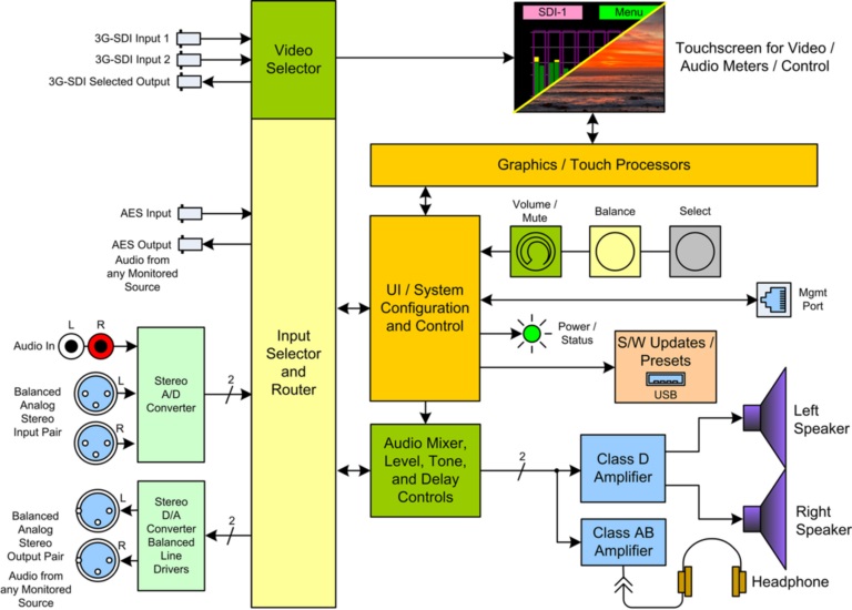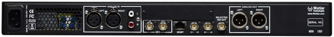 1RU single 2.4" screen, 2 SDI inputs with a selected out on BNCs, a pair of AES in/outs on BNC, a pair of balanced Analog in/outs on XLR and a pair of unbalanced Analog inputs on RCAs. Includes 8 presets