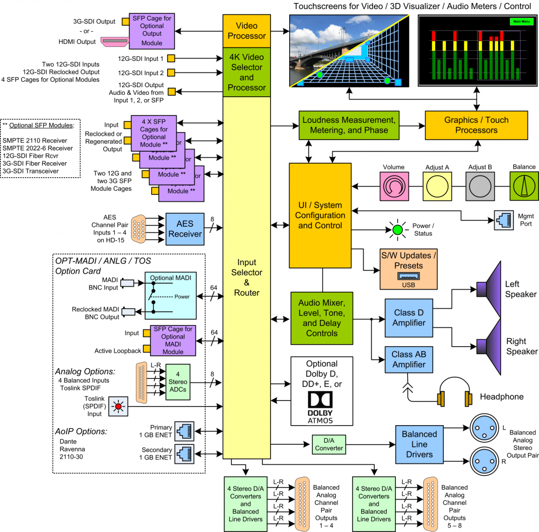 - Dolby® Atmos en option qui décode également les flux Dolby D, D+ et E pour la lecture, les mesures et les métadonnées.