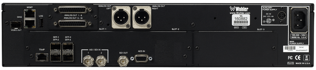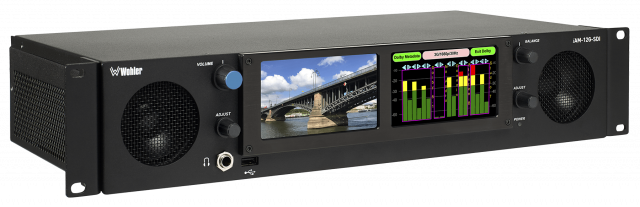 2RU Audio/Video monitoring and metering. 2 x SDI on BNC. 4 pairs of AES inputs on HD15, 16 analog outputs on 2 x DB25 & downmixed analog outputs on XLRs