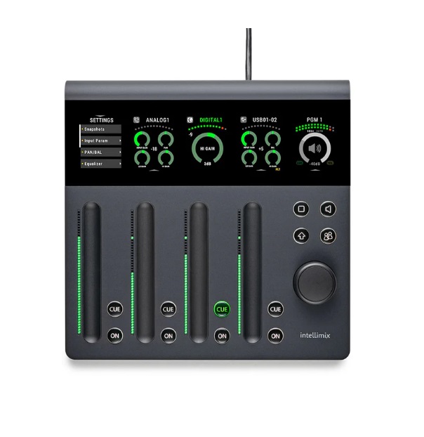 L'Intellimix NEO Desktop Mixer est une table de mixage à 8 canaux pour tout type de mixage audio ne nécessitant pas de connectivité AoIP. Il est doté d'entrées/sorties étendues et d'options de réglage détaillées. Intellimix NEO vous permet de contrôler huit entrées avec des canaux affichés sur deux couches. Il est conçu comme un appareil de mixage permettant de maîtriser toutes les tâches imaginables et complexes de mixage à 8 canaux pour tous ceux qui n'ont pas besoin de la connectivité AoIP. Grâce aux options de contrôle à distance, au mode administrateur et à un nombre illimité de profils d'utilisateurs, Intellimix NEO est idéal pour les lieux de travail partagés.Les éléments les plus importants de l'unité de contrôle Intellimix sont ses quatre faders G-Touch©, l'écran large multitouch et une commande rotative. En tant que toute nouvelle technologie de fader, le fader G-Touch© combine tous les avantages des types de faders existants d'une manière totalement nouvelle. Bénéficiez d'une réactivité et d'une orientation physique énormes en glissant vos doigts dans la rainure moulée. Utilisez l'option de préréglage des positions des faders et profitez des différents modes de faders et des diverses options d'indication par graphique à barres LED.