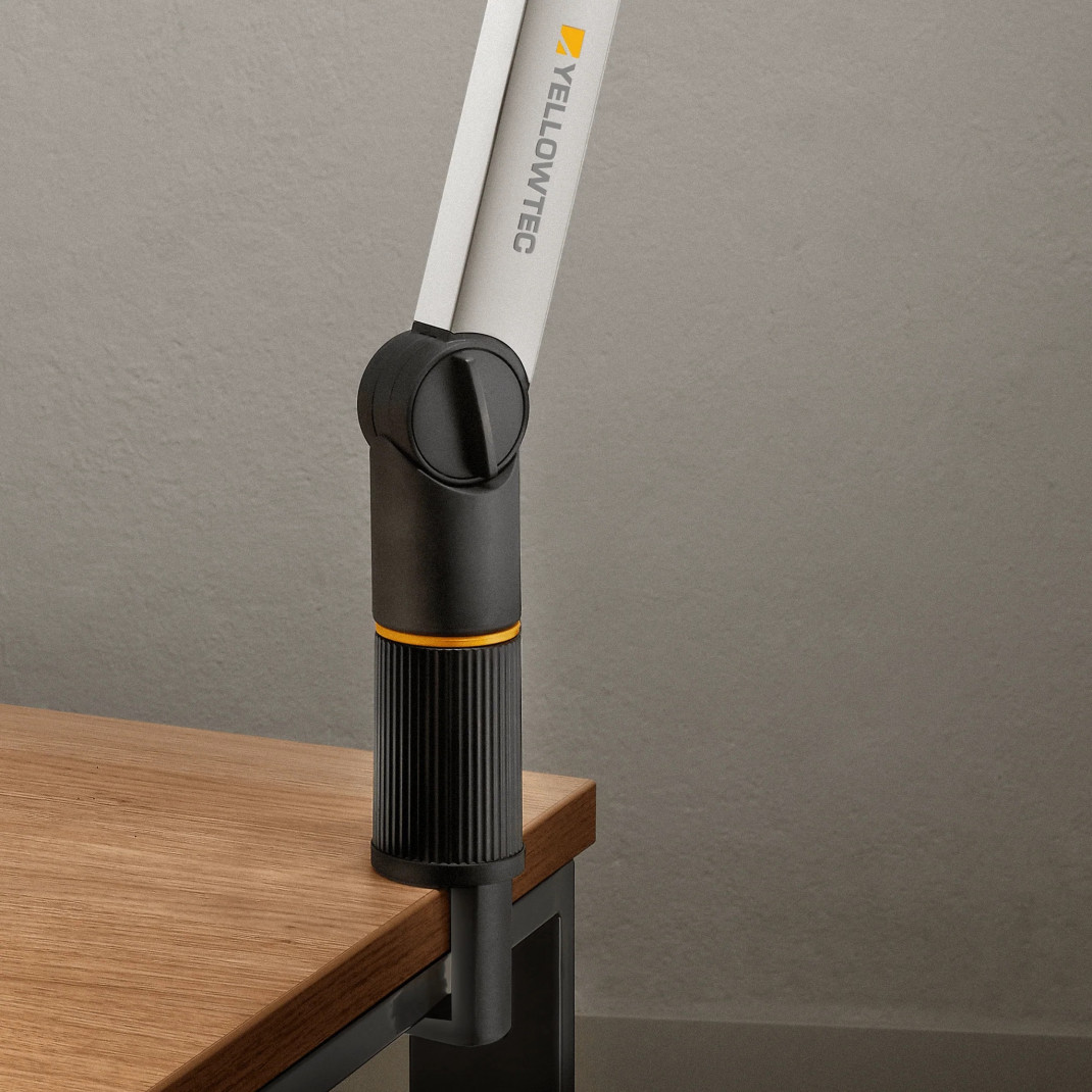La fixation de table m!ka est l'une des options permettant de monter un bras m!ka sur votre bureau. Elle peut être combinée avec un bras de microphone m!ka ou un bras de moniteur m!ka EasyLift. Utilisez la pince de table pour fixer votre bras m!ka sur le bord de votre bureau. Fixez la pince de table m!ka à votre bureau, puis placez l'entretoise jaune sur le dessus et glissez le bras m!ka de votre choix.Pour obtenir un ajustement correct à votre bureau, il suffit de placer la pince de table m!ka sur le bord de votre table et de tourner les parties supérieure et inférieure l'une contre l'autre. La pince de table s'adapte à toutes les tables dont l'épaisseur du panneau est comprise entre 18 et 72 mm. Ne l'utilisez jamais sur des surfaces courbes. Elle pourrait glisser.
