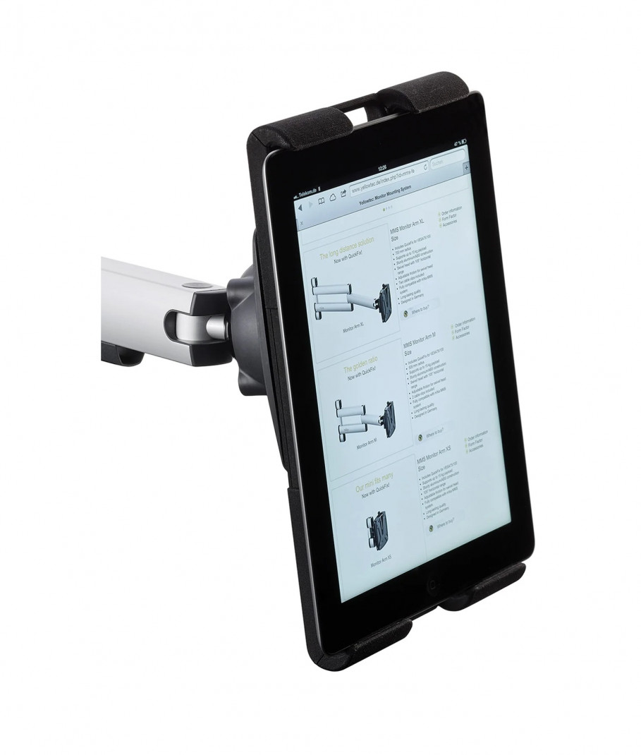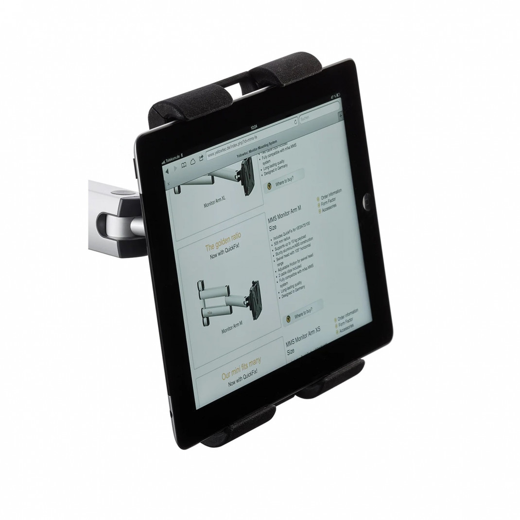 Avec m!ka Pad-Dock, vous pouvez fixer votre tablette en toute sécurité. Faites-en un élément essentiel de votre espace de travail en un clin d'œil. Choisissez simplement votre bras de moniteur m!ka préféré et attachez le m!ka Pad-Dock à votre studio m!ka via QuickFix. Afin de tenir la tablette correctement, sa longueur latérale doit être comprise entre 16 et 30 cm. Les tablettes s'adaptent aussi bien à l'horizontale qu'à la verticale.