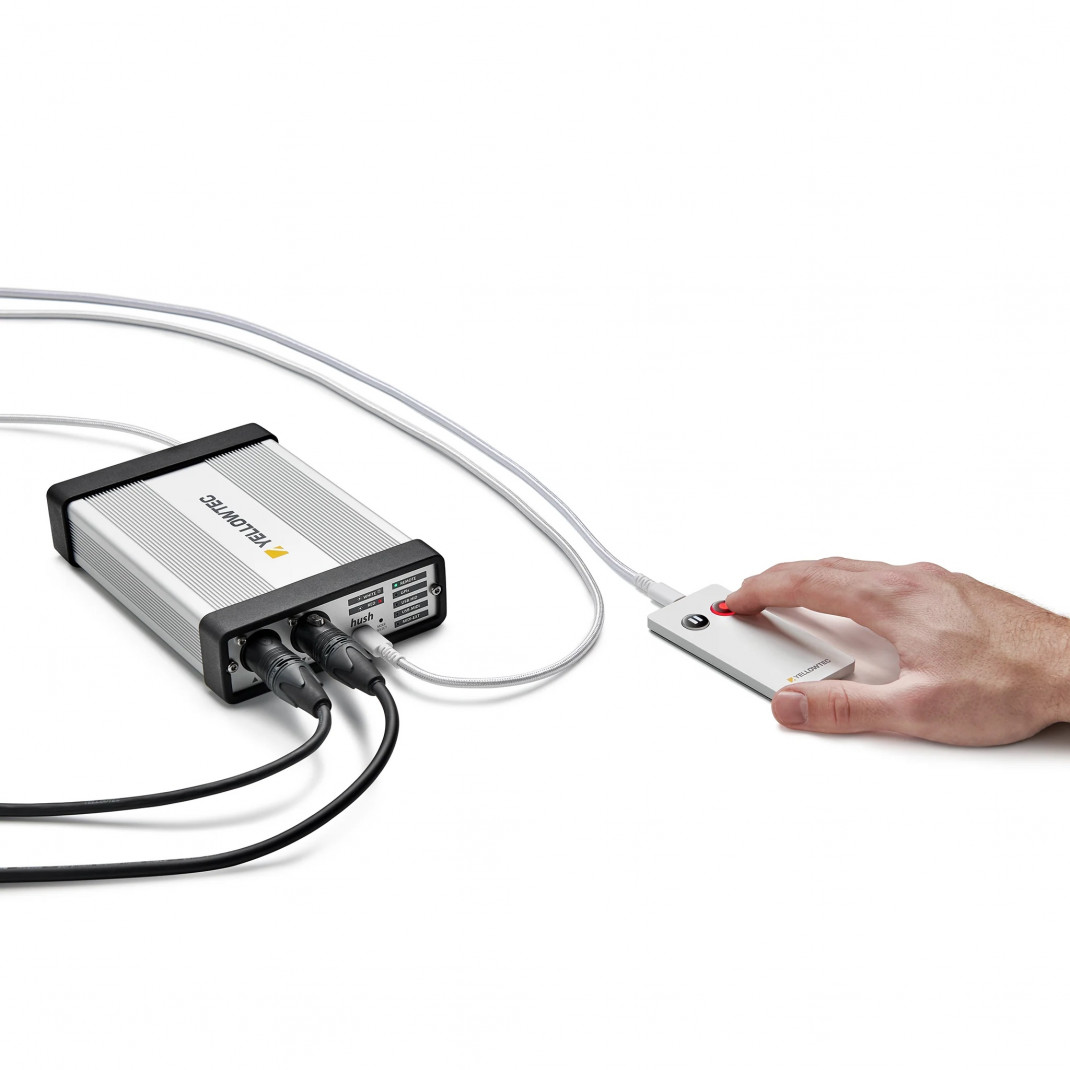 Le bouton mute de la télécommande hush est conçu comme un bouton de toux. Comme seul le modèle hush+ avec son préampli traite votre signal audio, la fonction mute n'est disponible qu'avec hush+. Appuyez sur le bouton muet et maintenez-le enfoncé pour couper le signal de votre microphone. Un indicateur OnAir blanc brillant sur votre bras de micro m!ka ainsi qu'un bouton Mute jaune et un bouton OnAir rouge clignotant sur la télécommande hush indiquent sans équivoque la mise en sourdine. Relâchez le bouton Mute pour réactiver le signal de votre microphone. Le voyant OnAir s'allume alors à nouveau en rouge et vous êtes de nouveau à l'antenne.